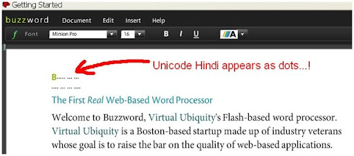 Adobe's flash based online word processor - Buzzworld claims to be The First Real Web-Based Word Processor, but it failed in many count. Firstly, it is not UNICODE compliant. At least, it had not displayed Unicode Hindi content, and you cannot input Hindi Unicode matter in to it. Any Real Web app must be Unicode compliant these days.
